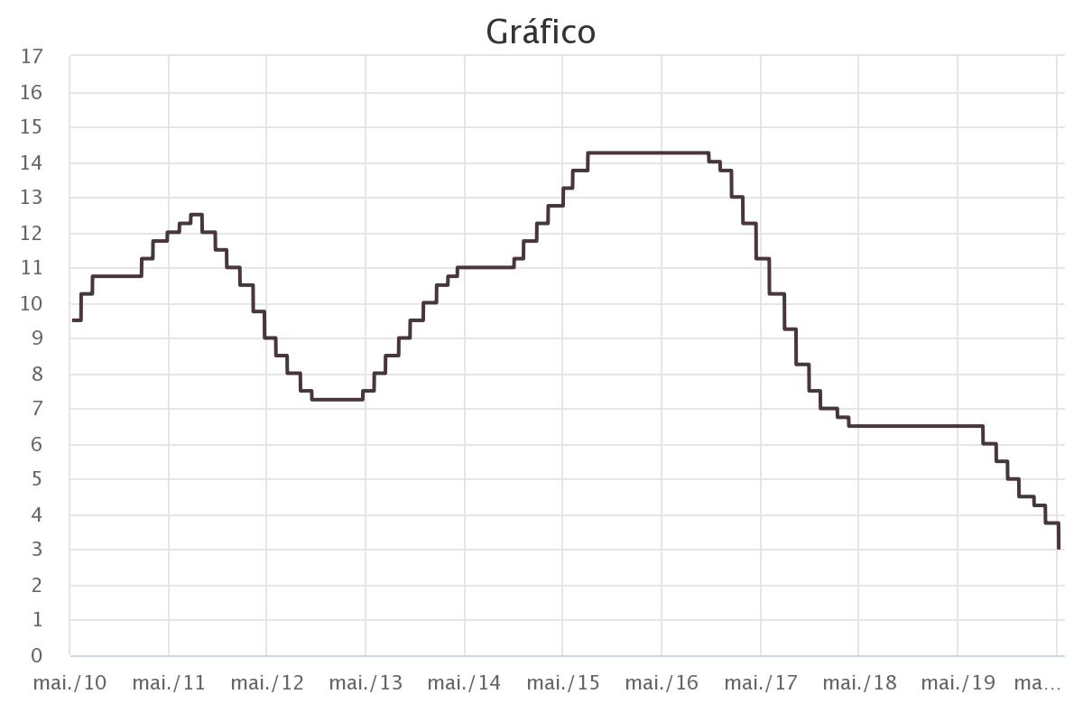 Abaixo coloco um gráfico mostrando o comportamento da Selic desde o início até o meio deste ano: