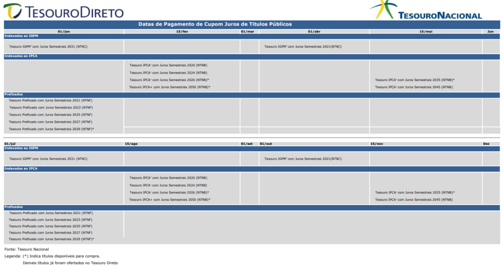 Segue abaixo uma tabela para a sua organização de quando receberá os Cupons de Juros dos Títulos do Tesouro Direto. Observe que é possível ter 6 meses do ano com renda.