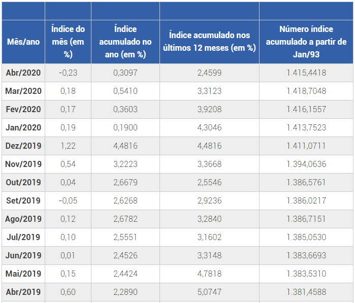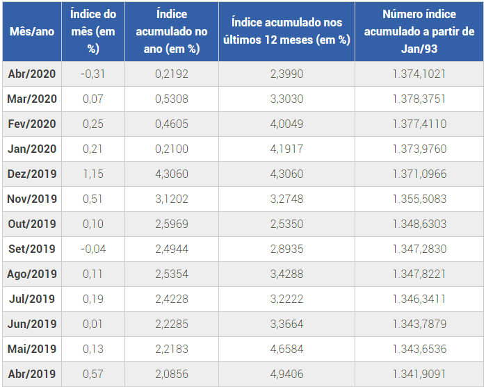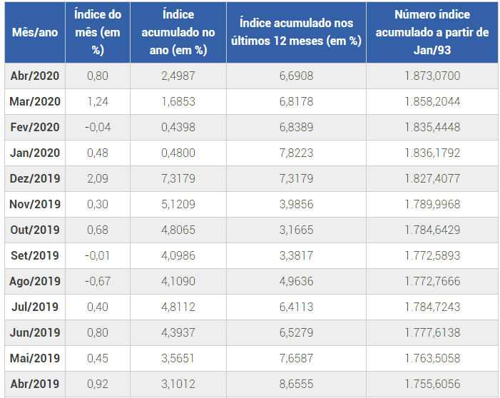 Abaixo uma tabela mostrando a inflação acumulada do ano de 2020, dos últmos 12 meses e desde sua criação em 1993.