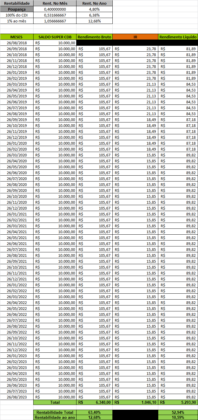 Abaixo uma simulação do quanto pode vir a render uma aplicação de R$ 10.000 nos 5 anos, lembrando que não estou considerando o REINVESTIMENTO do dinheiro, pois se o fizer, o retorno é maior, a simulação é para quem quer utilizar o dinheiro para o dia-a-dia: