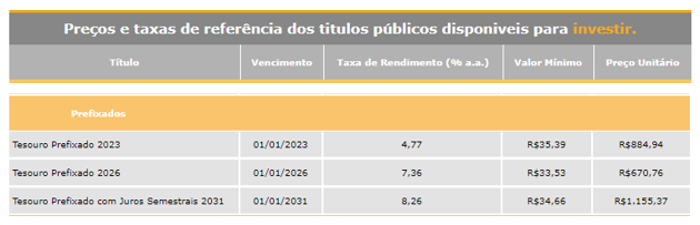 - Tesouro Prefixado: possui uma taxa prefixada que permanece a mesma durante todo o período do investimento. Não depende de nenhum fator.
