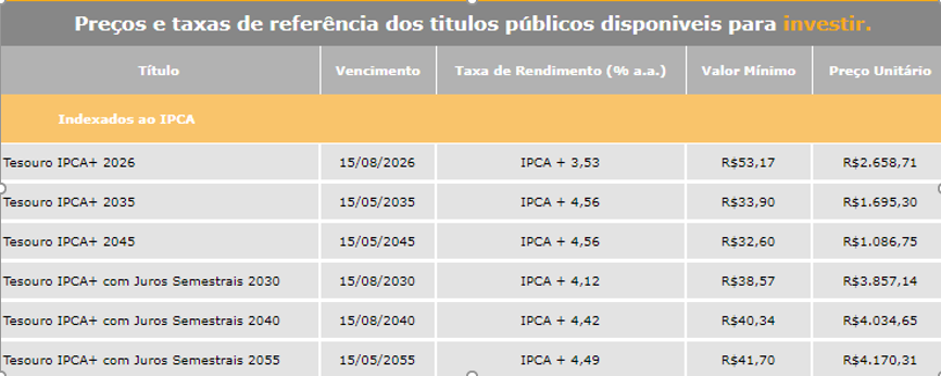 - Tesouro IPCA: é um pós-fixado que tem como indexador a inflação, ou seja, o IPCA;