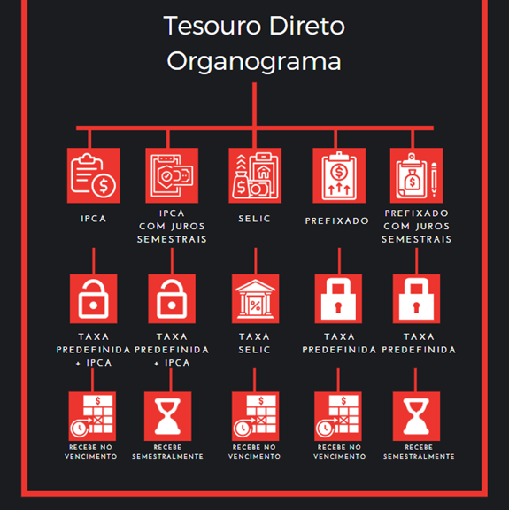 Como vimos acima, são dois tipos básicos de títulos oferecidos pelo Tesouro Direto, os pós-fixados e os prefixados. Os ativos à disposição podem render juros fixos anuais, um juro fixo mais a variação do IPCA e a variação da Selic.